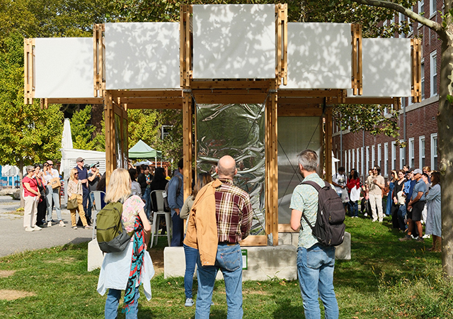 Above the sitting area in the rooms are beams mounted against a stark white ceiling to reflect the historic local architecture.